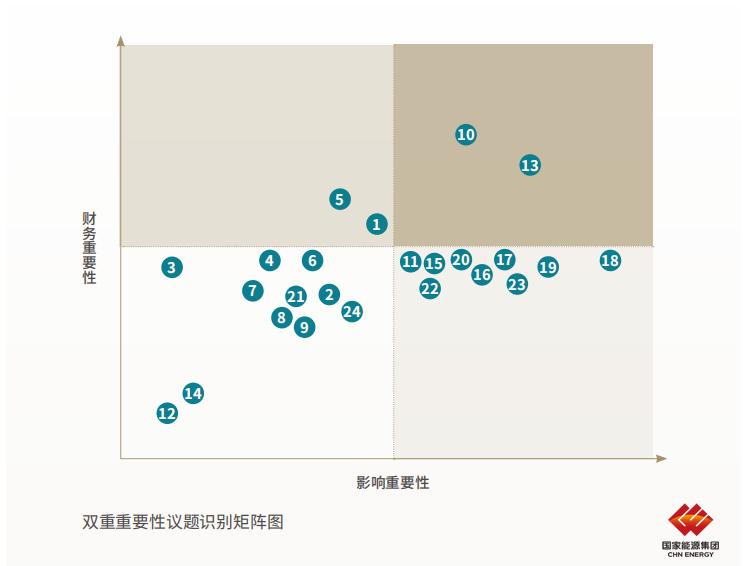 公司可持续发展委员会审阅并确认本年度议题矩阵,我们识别出24项议题均具有影响重要性。在报告中采取治理,战略,影响、风险和机遇管理,指标与目标四支柱的方式对应对气候变化、环境合规管理、创新驱动和可再生能源发展等4个具有财务重要性的议题进行披露。