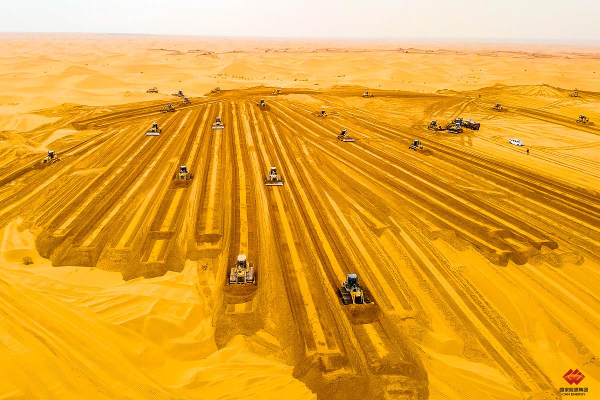 2022年11月17日,国家首批首个“沙戈荒”新能源基地中卫100万千瓦光伏项目正在开展场地平整工作,标志着基地项目进入大规模建设阶段。龙源电力宁夏腾格里“沙戈荒”新能源基地作为我国首批、首个“沙戈荒”新能源基地,项目将8.8万亩不毛之地转化为“能源绿洲”,实现了从黄沙漫卷到绿电奔涌的跨越。刘天齐 摄