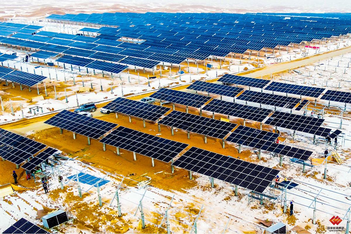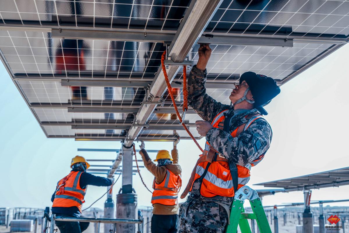 2023年1月10日,龙源电力宁夏腾格里“沙戈荒”新能源基地中卫100万千瓦光伏项目正在开展光伏板安装作业。该基地首批300万千瓦光伏项目分两期建设,一期100万千瓦,二期200万千瓦,总计占地约8.8万亩,共安装光伏板460余万块,配合平单轴自动追光系统,最大化捕获光能,较固定可调支架可提升约10%发电效能。刘天齐 摄