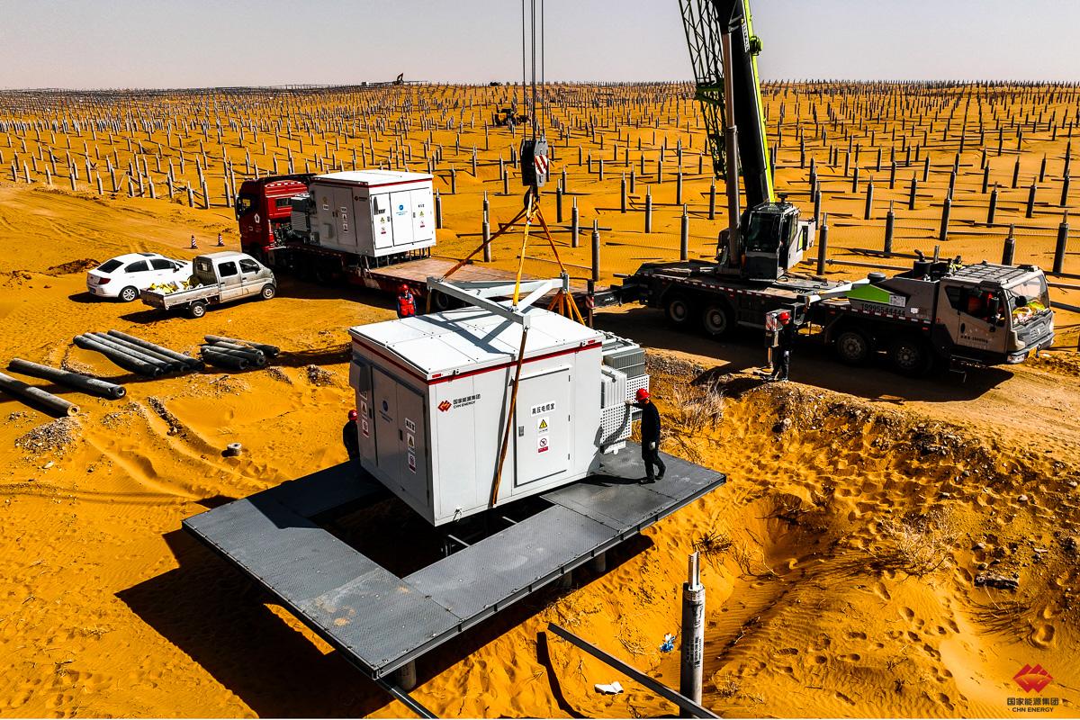 2024年3月22日,龙源电力宁夏腾格里沙漠“沙戈荒”新能源基地中卫二期北区100万千瓦光伏项目正在开展箱变吊装作业。该基地全部采用预制桩+钢平台新型箱变基础,此箱变基础有效解决普通混凝土基础在沙漠施工难度大,成本高等问题,还可有效避免风沙对箱变的侵蚀。张乾斌 摄
